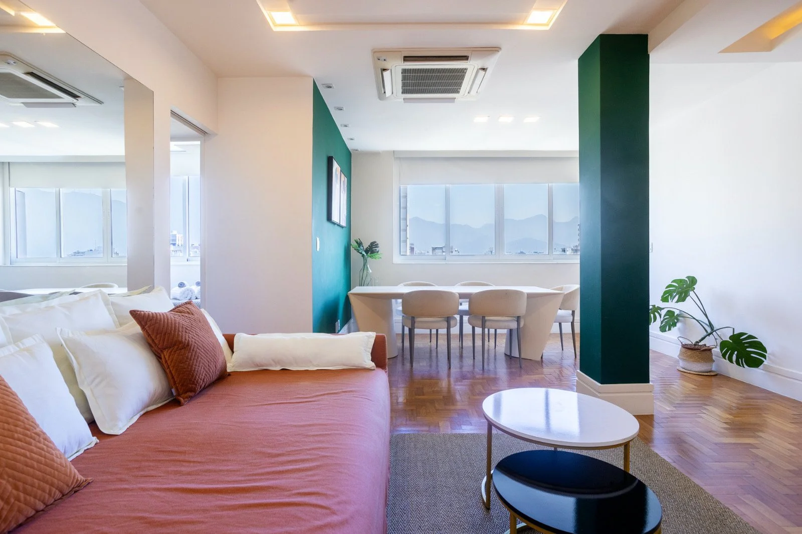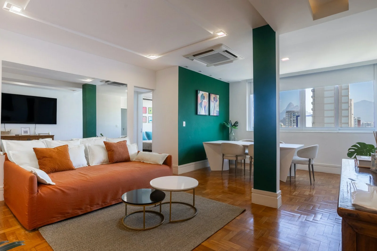 The first thing you notice is the view. Dois Irmãos, the twin mountain peaks that rise above Ipanema, frame perfectly in the living room window. Natural light floods in from the 10th floor, and at nearly 1,000 square feet, you have room to actually settle in.